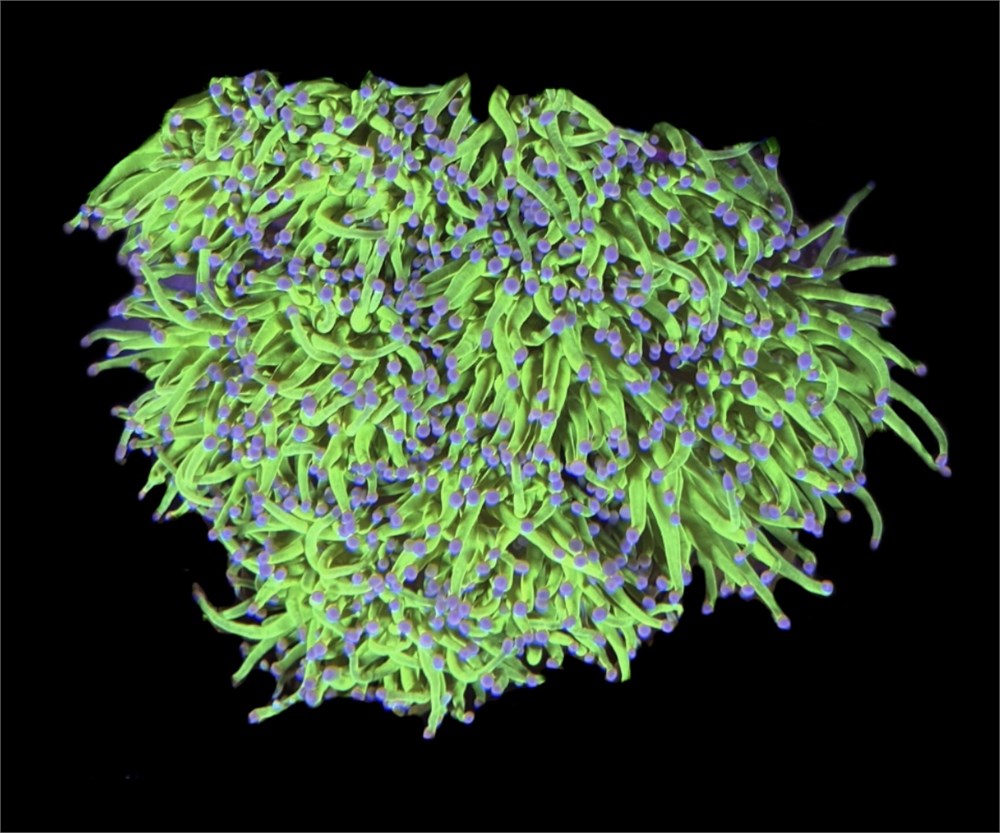 CRAZY BRIGHT!! This Cotton Candy Torch Colony was grown right here at GHI Corals and features bright neon green stems with pink tips! This colony has FIVE PLUS heads and is very healthy!