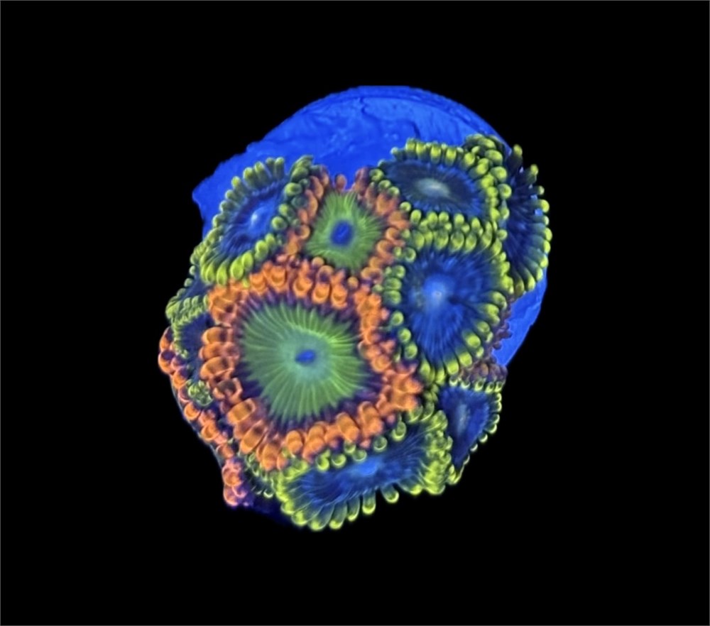WYSIWYG GHI Corals Zoa Combo Frag with Smurfette Zoanthids, and Electric Oompa Loompa Zoanthids approximately 13+ polyps