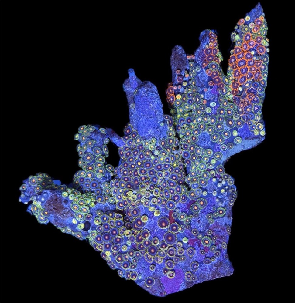 WOW! This amazing colony is packed with FIVE crazy colored zoanthid strains! Whether you are adding to a existing zoa garden or just getting started, this is the colony for you!!