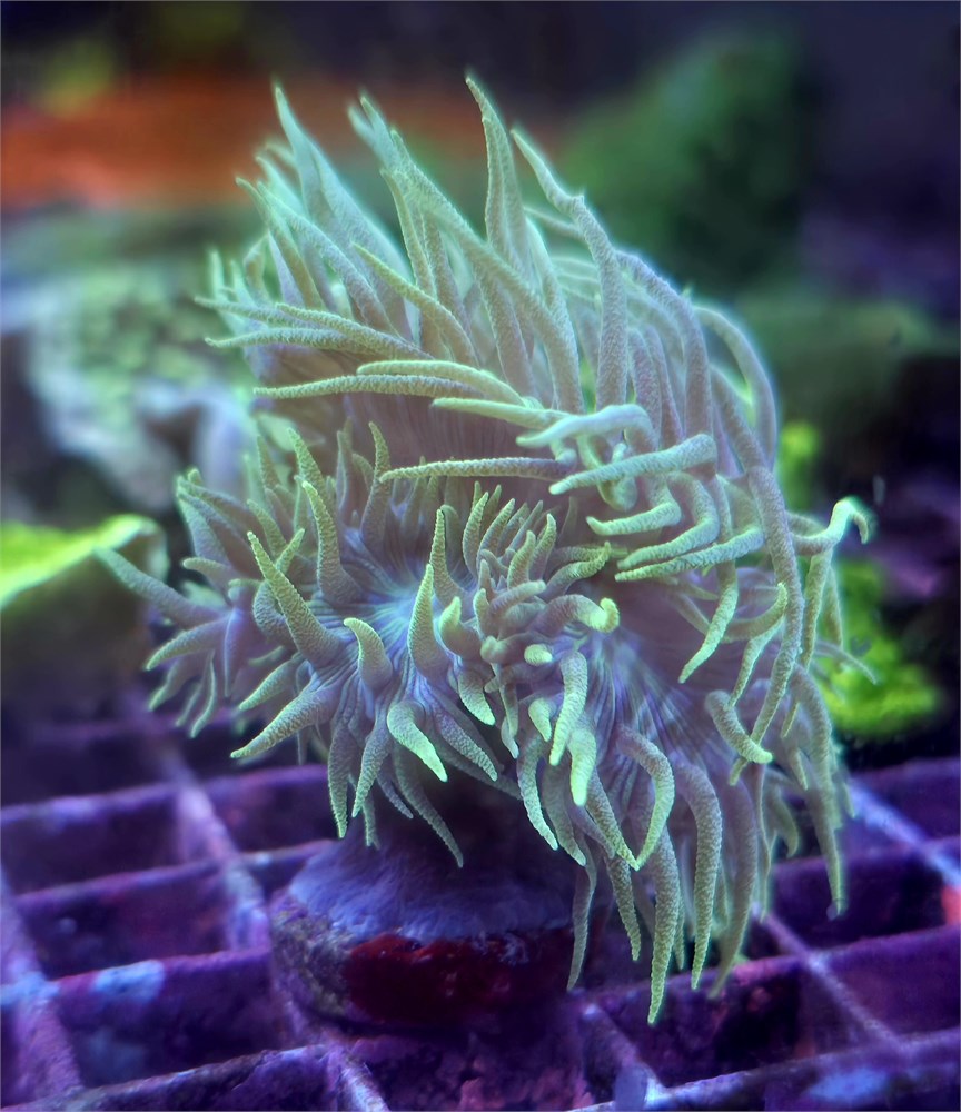 A hardy, beginner-friendly LPS coral known for its long, flowing tentacles and bright green polyps with contrasting centers. Duncan corals extend fully during the day, adding great movement and color to any reef. They adapt well to moderate light and gentle flow, are easy to feed, and grow quickly under stable conditions—an excellent choice for both new and established aquariums.