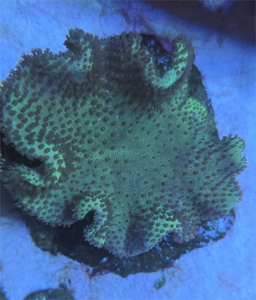 A large, eye-catching leather coral known for its broad, umbrella-shaped cap and extended polyps that create constant movement in the tank. Hardy and adaptable, this coral thrives in moderate light and flow and is well suited for both mixed and soft-coral reefs. A great statement piece that adds size, texture, and natural motion to any aquarium.