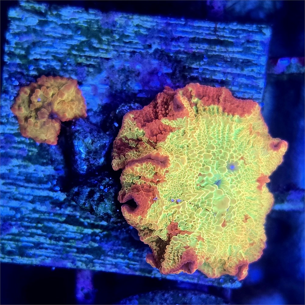 A rare and highly collectible mushroom coral featuring vibrant swirls of red, orange, yellow, green, and blue that intensify under blue lighting. Known for its bold “jawbreaker” patterning and slow, deliberate growth, this mushroom thrives in low to moderate light and gentle flow. An exceptional showpiece for collectors and high-end reef aquariums.