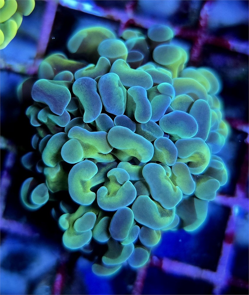 A striking LPS coral featuring thick, tubular “hammer”-shaped tips with vibrant neon colors that shimmer under actinic lighting. Hardy for a hammer coral, it thrives in moderate light and gentle to moderate flow. Its bold coloration and flowing movement make it a standout centerpiece for any reef tank.