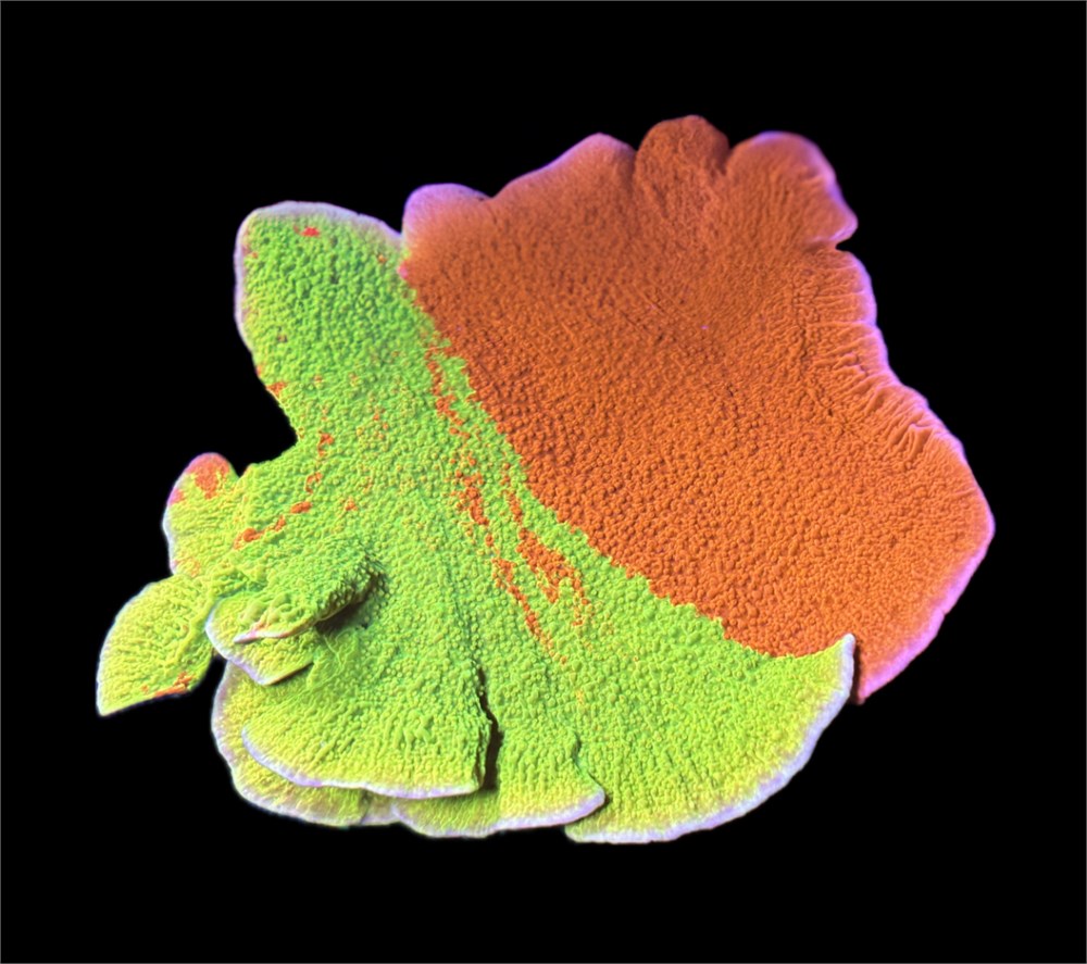 BRIGHT! This colony was grown right here at GHI Corals and is a PERFECT 50/50 split or orange and green! This type of montipora encrusts, and plates out into the water column and is amazing choice for beginners getting into the SPS world.