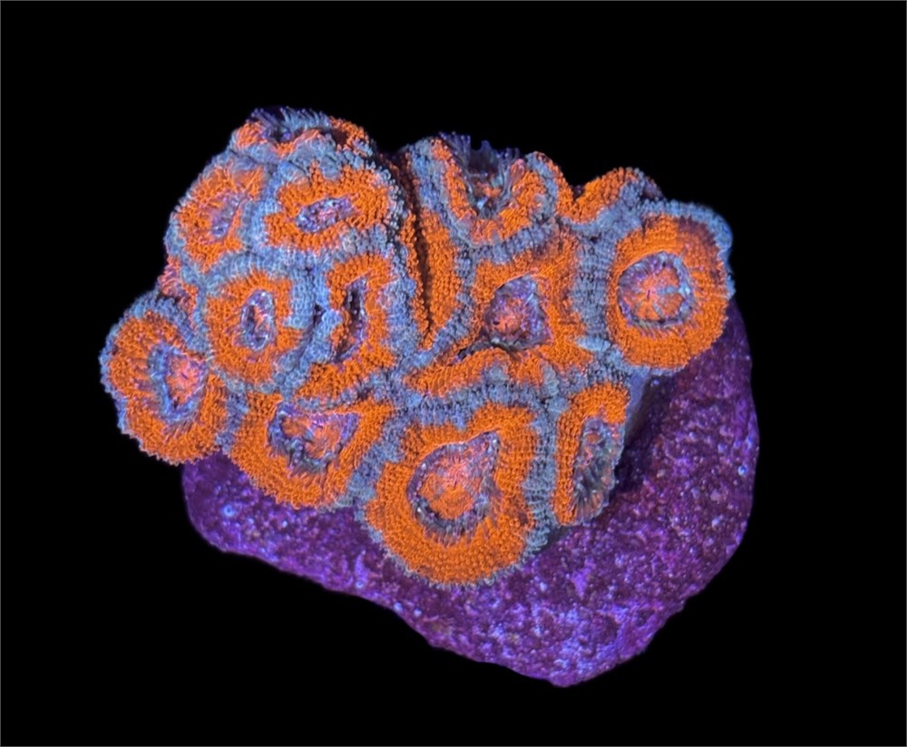 Crazy bright orange polyps with perfect bright blue rims! This coral will benefit from weekly feedings but is not required.