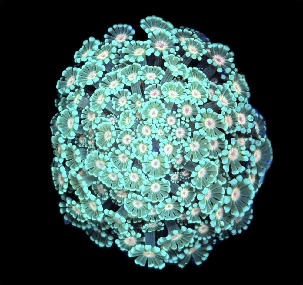 WOW! The brightest strain of alveopora we've ever seen! This mini colony has crazy bright and unique green/blue stems with an amazing peach center! This one is sure to be your new favorite in your collection.