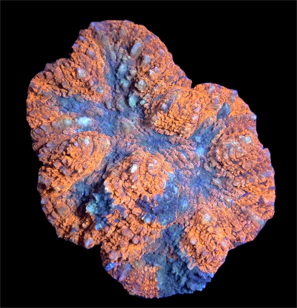 WOW!! This amazing symphyllia has a very unique orange coloration with blueish splatters/ grafts around the entire colony. Perfect for your high end LPS collection! Symphyllia will benefit from weekly feedings but is not required!