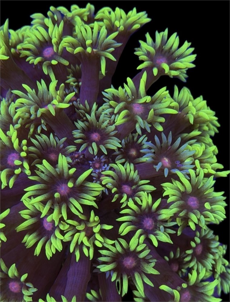 UNIQUE!! Amazing pinkish stems with green/yellow skirts and red eyes! If you look closely this colony has naturally grafted BLUE skirt polyps in the middle of the colony as well making this piece truly unique!