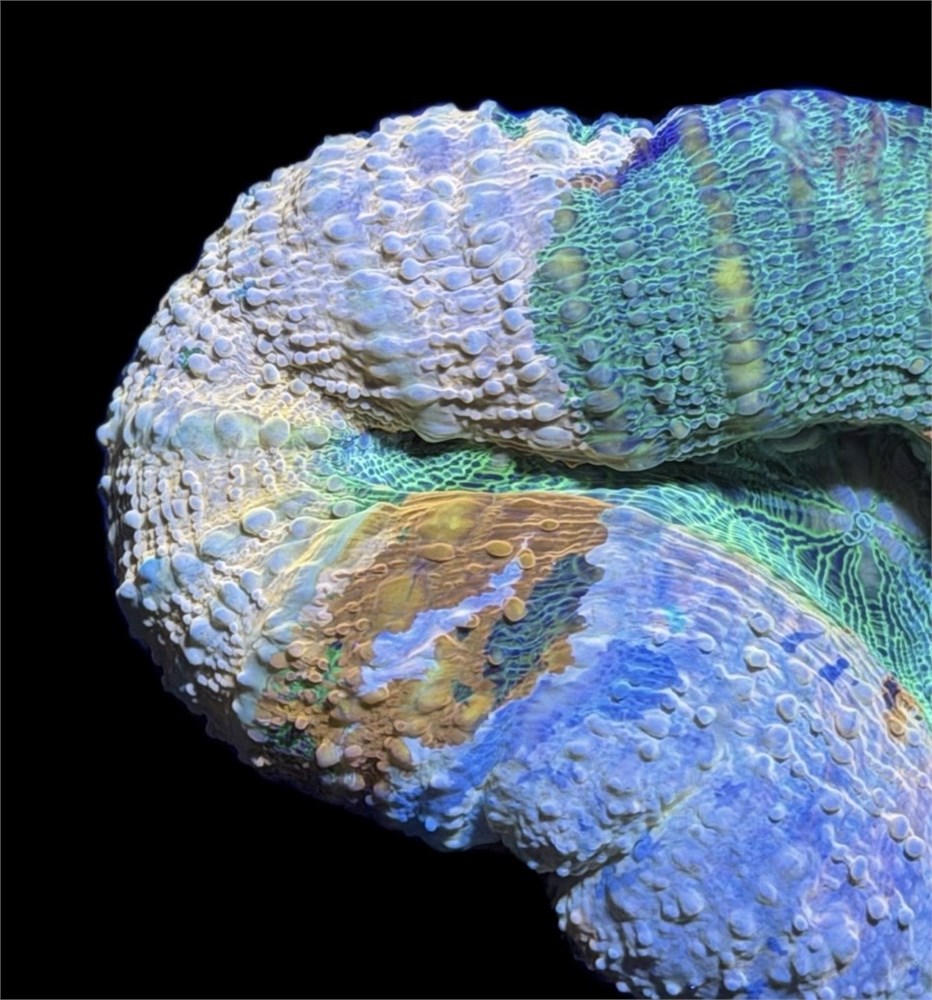 ONE OF ONE! Is this the craziest coral you've ever seen? We've been keeping this lobo in our systems for over 3 years and is now time to let her go to a very lucky collector. This coral is an absolute one of one that you will likely never see again. Truly amazing coloration with blue, green, orange, gold, pink, and more! Not to mention the amazing patterns on this coral, it is one you can stare at for days!