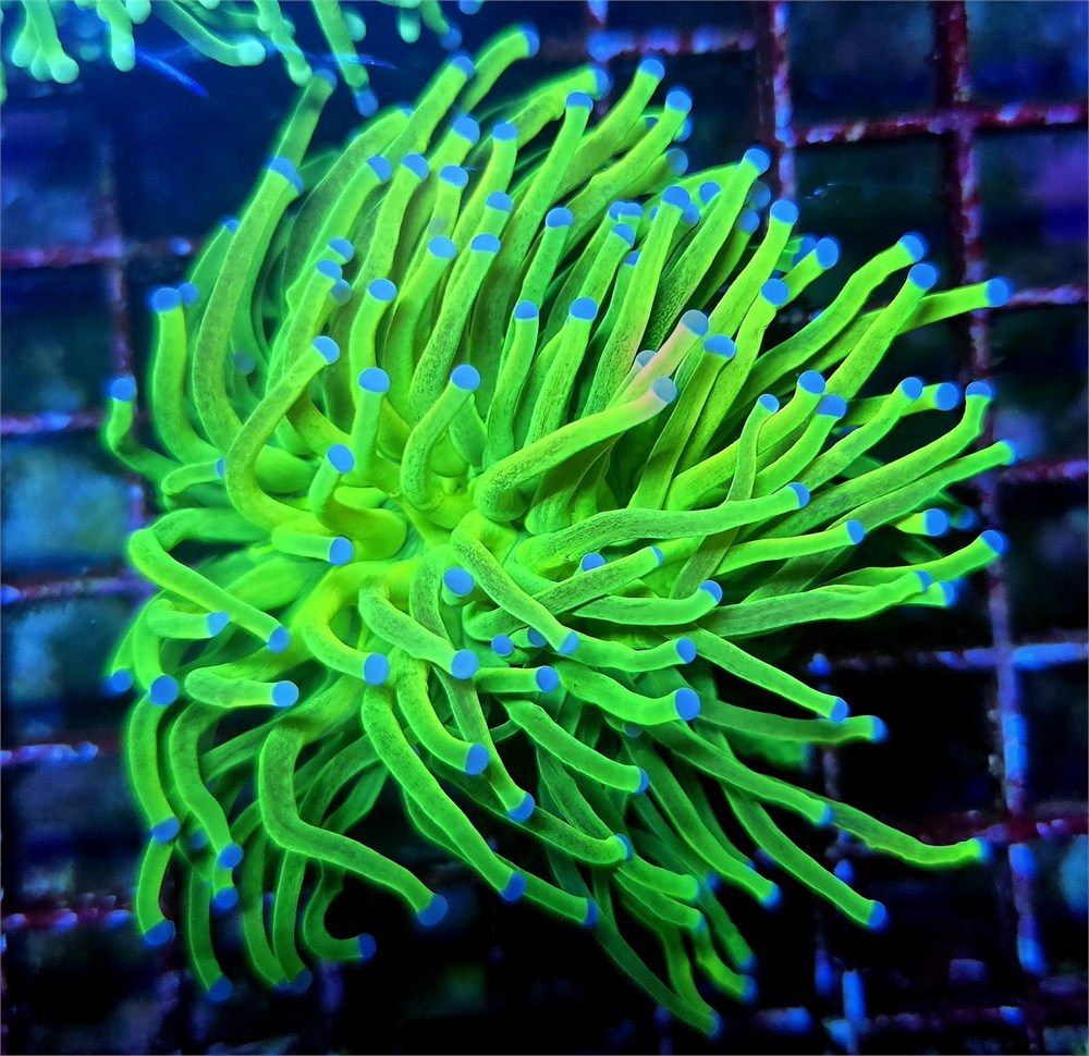 A spectacular torch coral featuring long, flowing polyps with neon green tips that glitter under actinic lighting, set against a contrasting base color. Hardy for an LPS, it thrives in moderate light and flow, adding dramatic movement and vibrant color to reef tanks. A standout centerpiece for both collectors and display aquariums.